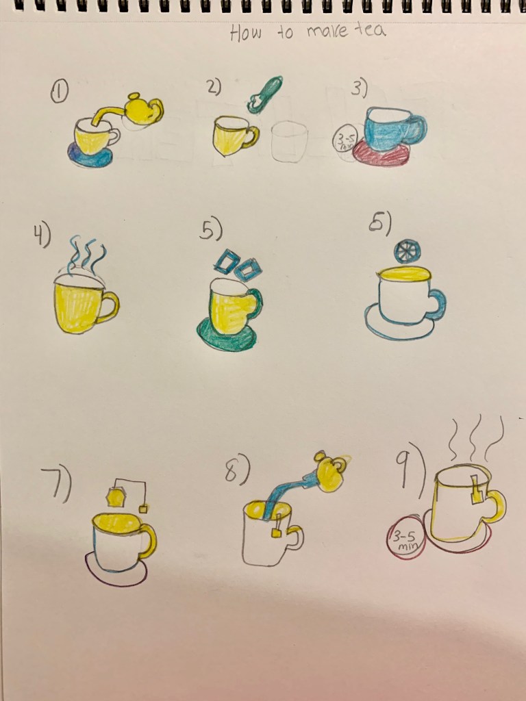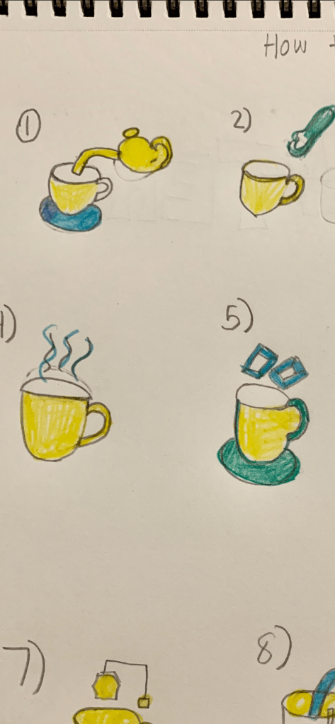 What were you trying to achieve? The task that I am achieving is the How- Make and how -to draw a hot beverage drink. The hot beverage I choose was how to make hot tea step by step. The problems I encountered was to think about how someone would follow the directions of what I drew to make a hot cup of tea. Another problem was trying to how I would vision my image of the pictures on to the paper step by step. What was your AHA! Moment? My AHA moment was that in drawing this picture was that I found it interesting how I drew the cup in step by step motions and this is how I make my tea but without the ice. What connections did you make to what you have learned in the readings and in class? The connections to the reading that I made was that in class was to the McCloud book of him showing the different steps of different objects and to show the simplified representations of the instructions shown in the book. There are smaller images with each step to enhance the details. What would you do differently had you more time or resources? If I had more time I would actually write out the steps of how to draw a hot cup of tea on the piece of paper and also try to give the person drawing it more tips so they could draw it exactly the same. I am going to now describe the step by step motion of how to make tea in sentences. The first step to making tea is that you want to grab a mug or a cup choose what you like and pour the hot water into it. Second you want to pick the tea bag and put it in a cup. Third you want to put a spoonful of sugar into it if you decided. Fourth you want to heat your mug or cup for 3-5 minutes long. Let your cup sit for a little while until it’s cool and if you would like you may add ice. Finally, you could have a nice cup of tea and enjoy it on a cozy day. The other idea I found tricky was to find a color that actually looked like tea. I tried to make it abstract and as colorful as I could. This time I switched it up and used colored pencils instead of sharpies to see if it works differently and in my opinion I really liked how the colored pencil worked out and it turned out. I liked using the three dimension step by step of how to draw these pictures. If I were to look at this diagram I would know how to make tea. How I would put myself in this place of position is that I would try to look at the diagram and follow the steps of each picture from step one to step eight. But overall I like this representation of how to make tea.