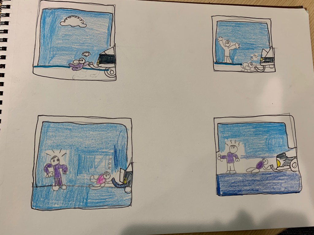 My goal for this assignment was to create a storyboard by trying out different story transitions. While creating this storyboard I encountered some problems. One of the problems I encountered while creating my storyboard was trying to figure out the transitions I should use in the four panels that I created. My AHA! moment was when I could identify the transitions within my storyboard very easily. While creating this storyboard I looked into the McCloud readings. In this reading, I used the transitions from McCloud and related it to my pictures that I drew because in the pictures I used a couple of the transitions and they were subject to subject and action to action. What I would do differently is that if I had more time and resources in drawing my storyboards is that I would definitely think of a much better story that goes well with the transitions and how each storyboard will be different in a variety of colors so it would stand out more to many people. With the different effects of colors. In the fourth, storyboard picture there is a depiction of one guy and he is trying to figure out how to blow the oil tank so the SUV starts starting up. The second storyboard is showing his friend that was nice enough and came to ask him what he is doing to his car and how he is going to get it to work again. The third storyboard is dictating how it is almost close to working but not quite yet but it will get there. Lastly, the photo is that the friend wants him to help him move the car to a safer spot and that’s why he is pointing to the other side. The two nancy pictures I choose from where the Nancy by Olivia Jaimes for July 24, 2008 and Nancy by Olivia Jaimes for July 25, 2008. What I learned from McCloud is that it is important for actions to take place in real time meaning that actions are louder than words. The three transitions talk about how subject-to-subject talks about the scene or idea. Also action to action shows how it is a single subject progressing meaning through a specific movements. The second to last transition that I used is movement-to-movement because it is showing the different degrees of closure and showing the basic movements occurring in these photos. The transition choices that I chose in all 3 of my comics affect the audience’s perception by the movement and the symbols that the audience will see because it is showing the movement of the person side by side and shows the effects of each picture. The emotions of the audience is showing the different scenes in each of the pictures and is also showing how the timing of each picture is relatively the same in each of the storyboard. I liked drawing these storyboards because you could draw any picture and come up with a good story for each of the boards.